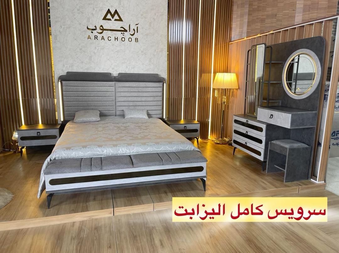 - شامل آیتمهای کامل سرویس خواب: تخت، دو عدد پاتختی، میز آرایش به همراه آینه و صندلی.